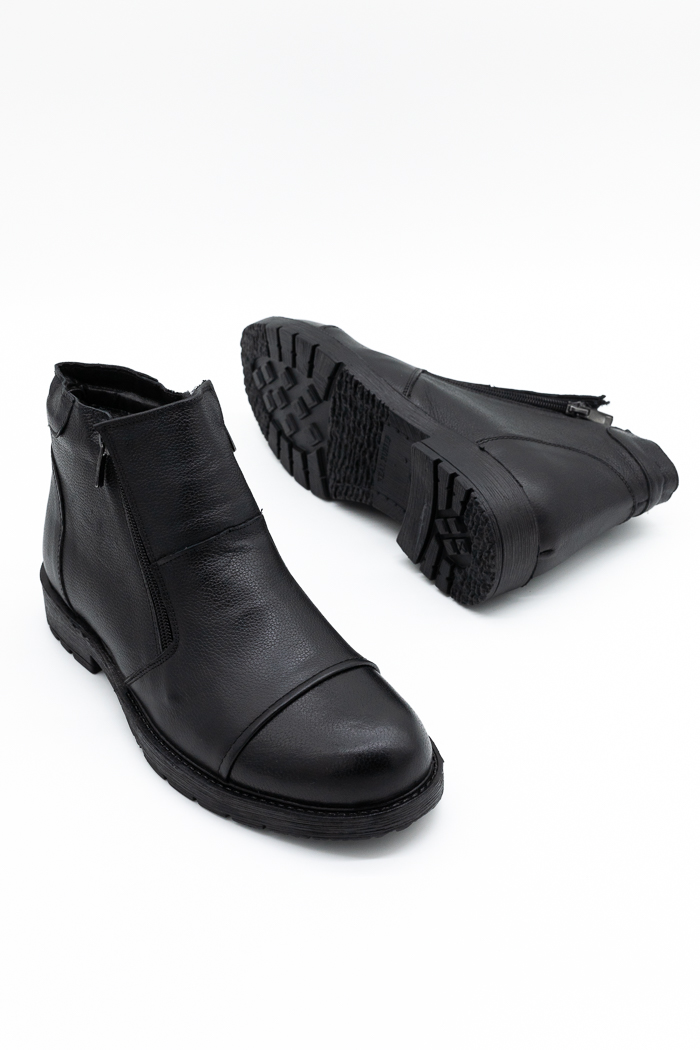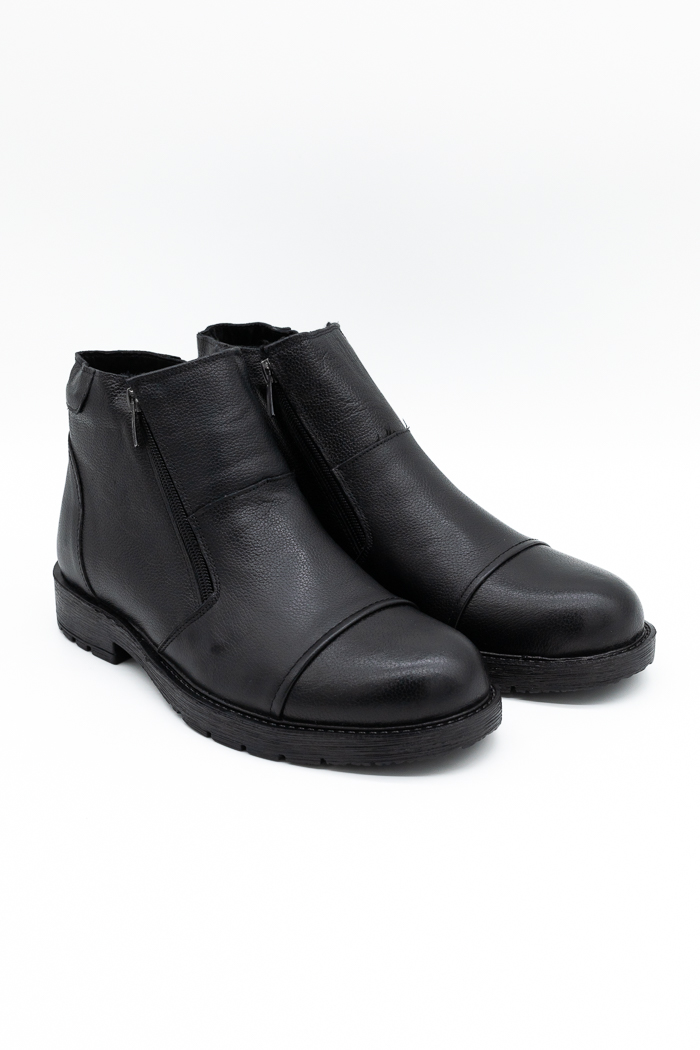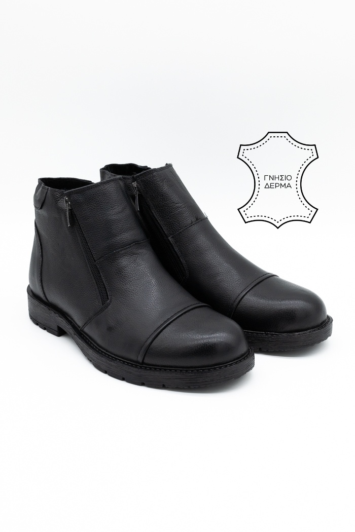 Ανδρικά μποτάκια κατασκευασμένα από γνήσιο δέρμα, με διπλό φερμουάρ για εύκολη εφαρμογή. Διαθέτουν επίσης εσωτερική γούνινη επένδυση και ελαστική  αντιολισθητική σόλα για άνετο βάδισμα.