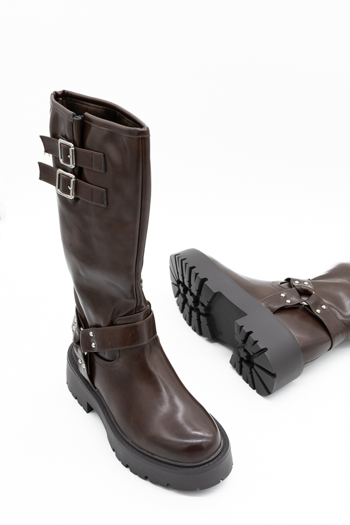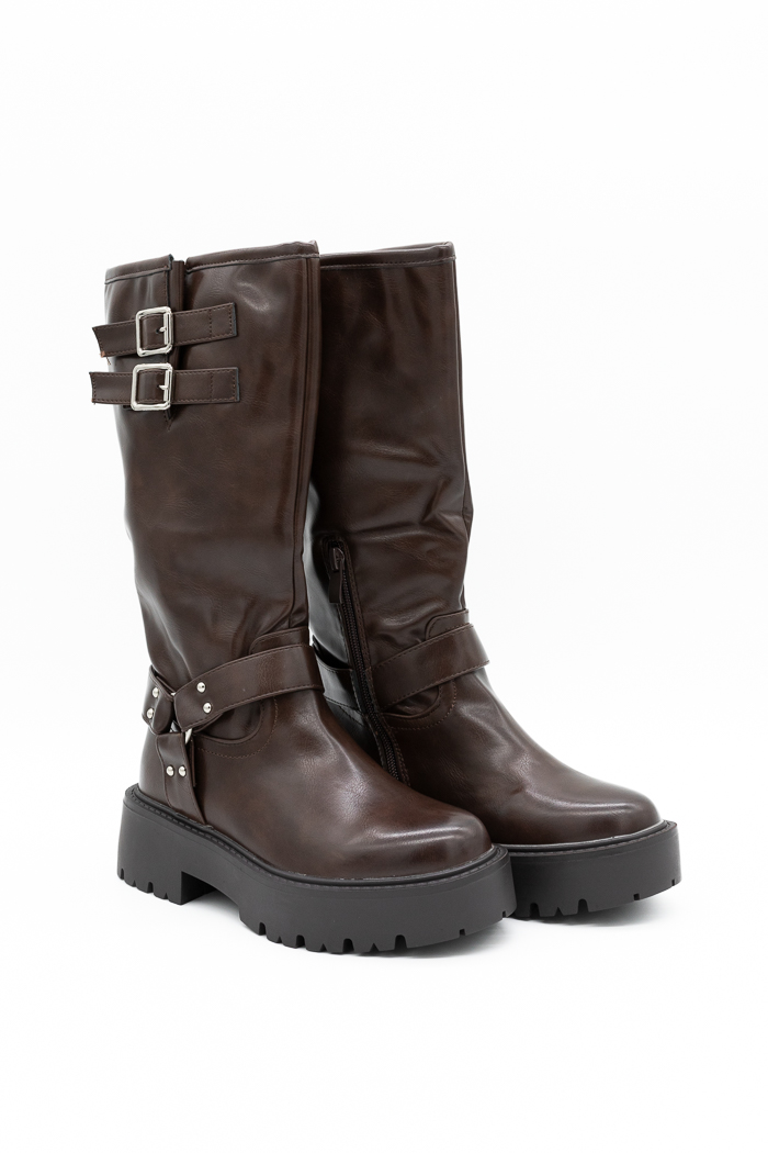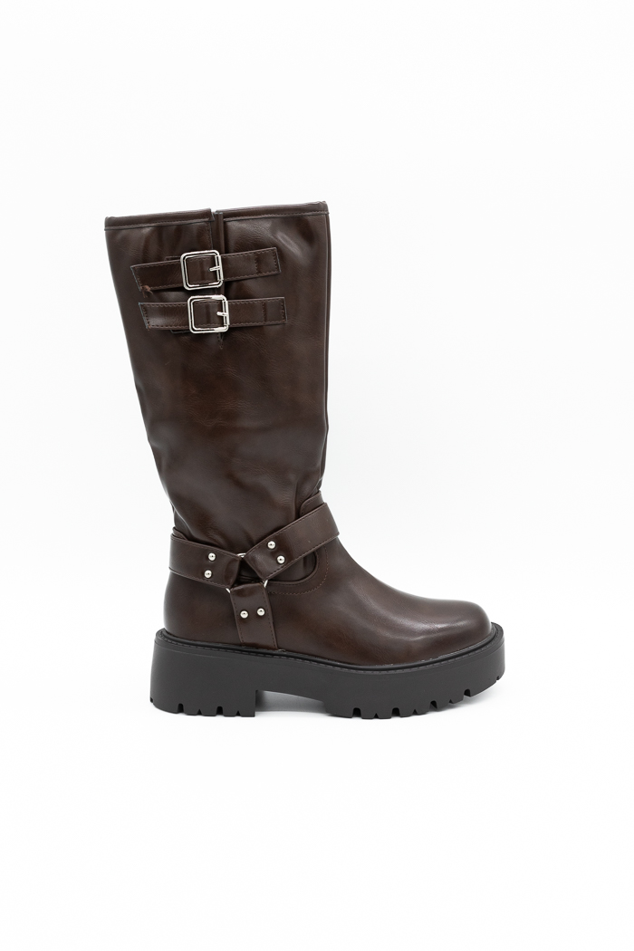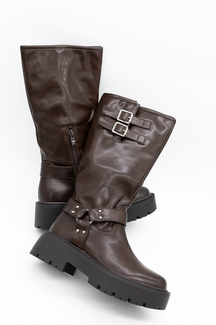 Μπότες biker με διακοσμητικά λουράκια και τορουκς-Καφέ