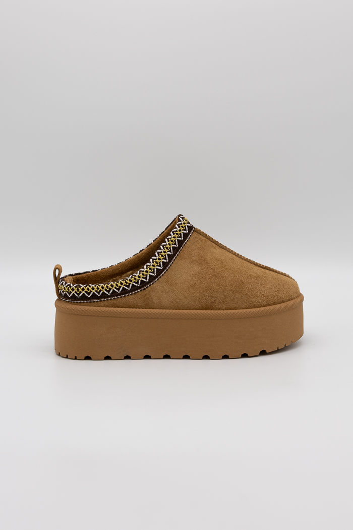 Suede clogs με γούνινη εσωτερική επένδυση, κατασκευασμένα από συνθετικό καστόρι και σχέδιο περιμετρικά στην ραφή.