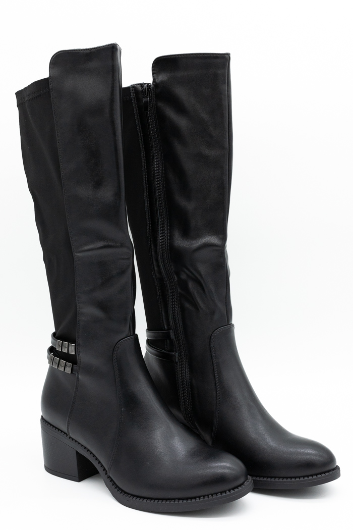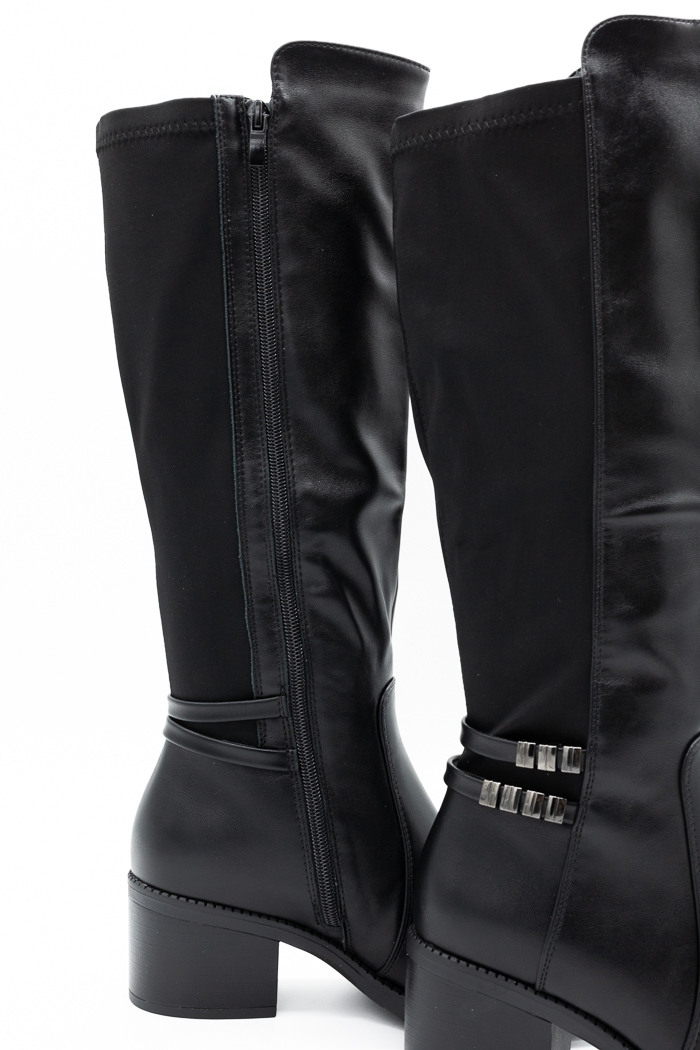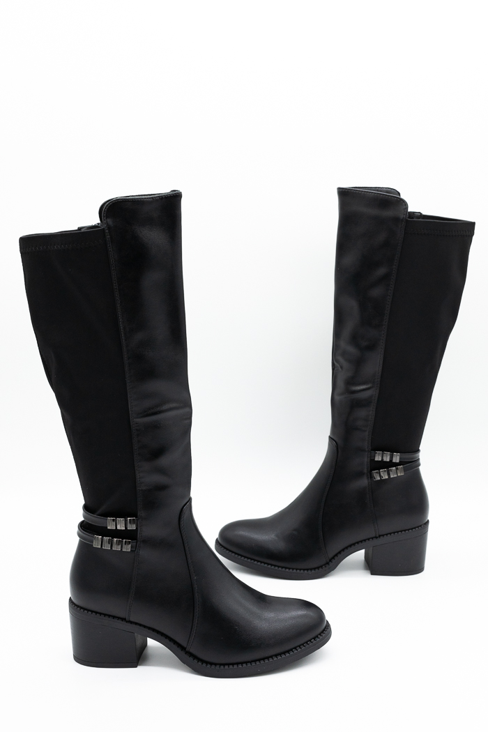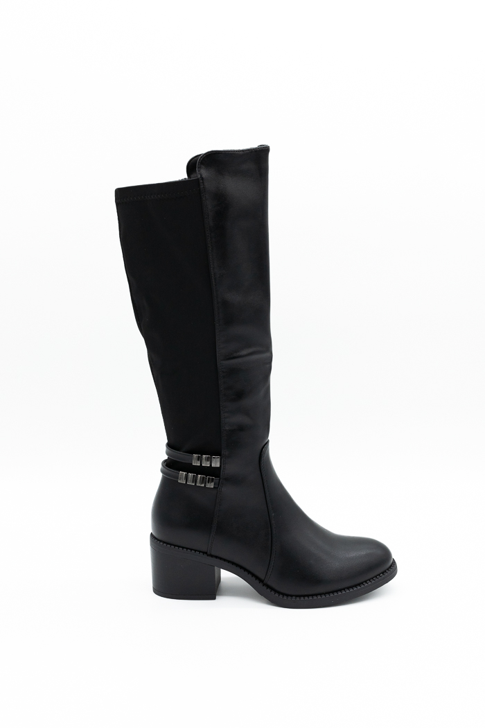 Μπότες με τετράγωνο τακούνι και λάστιχο στο πίσω μέρος για ακόμα μεγαλύτερη ελαστικότητα στην γάμπα. Είναι διακοσμημένες με λουράκια στο πλάι από μεταλλικές λεπτομέρειες, ενώ διαθέτουν αντιολισθητική  σόλα για άνετο βάδισμα και φερμουάρ από την εσωτερική πλευρά για εύκολη εφαρμογή.