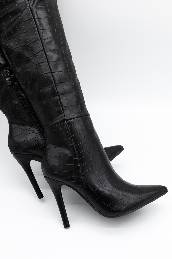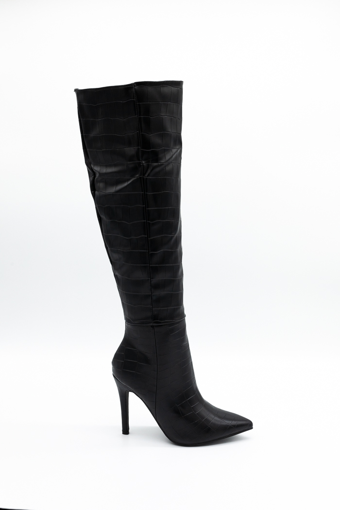 Μπότες μυτερές με λεπτό τακούνι και κροκό μοτίβο. Διαθέτουν αντιολισθητική  σόλα για άνετο βάδισμα και φερμουάρ από την εσωτερική πλευρά για εύκολη εφαρμογή.