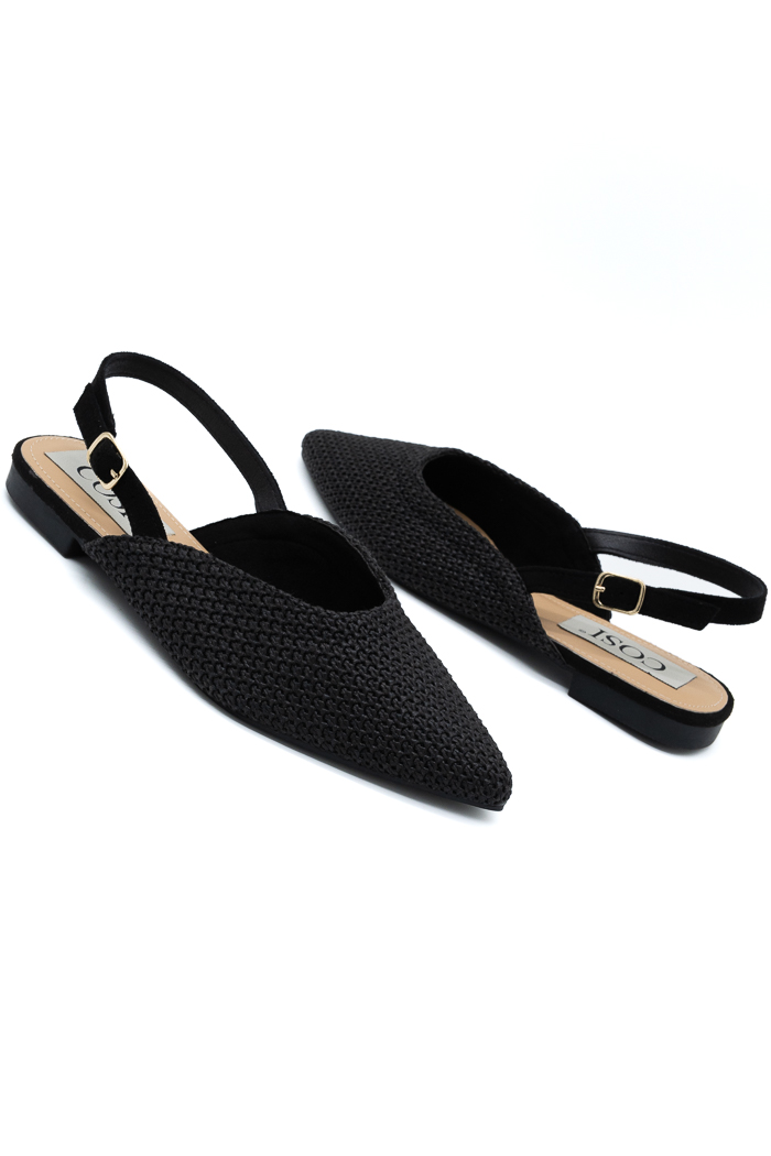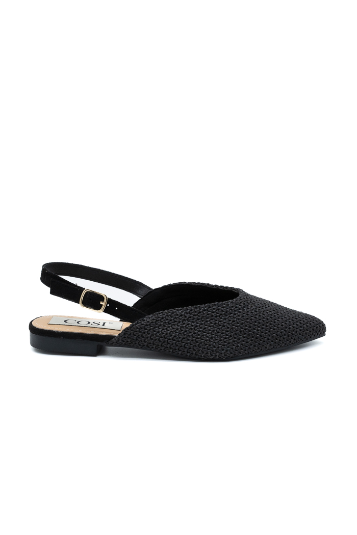 Μυτερά mules με ψάθινη πλέξη και λουράκι που αγκαλιάζει το πίσω μέρος του ποδιού, προσφέροντας σταθερότητα και στυλ. Ιδανική επιλογή για κομψές και άνετες καλοκαιρινές εμφανίσεις.