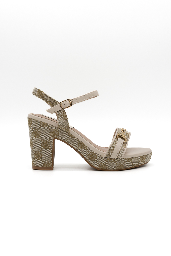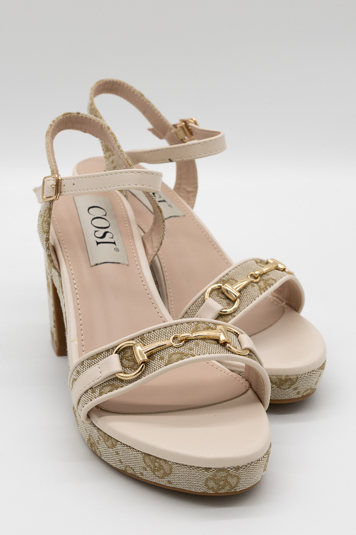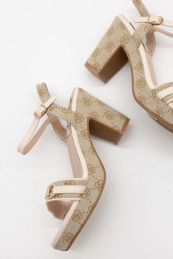 Πέδιλα με τετράγωνο τακούνι και μεταλλική λεπτομέρεια στη φάσα κεντημένα με σχέδιο περιμετρικά 199-20 Μπεζ