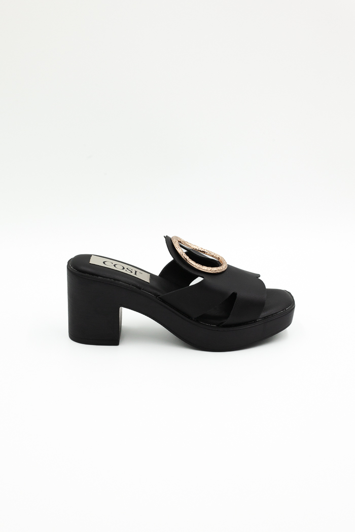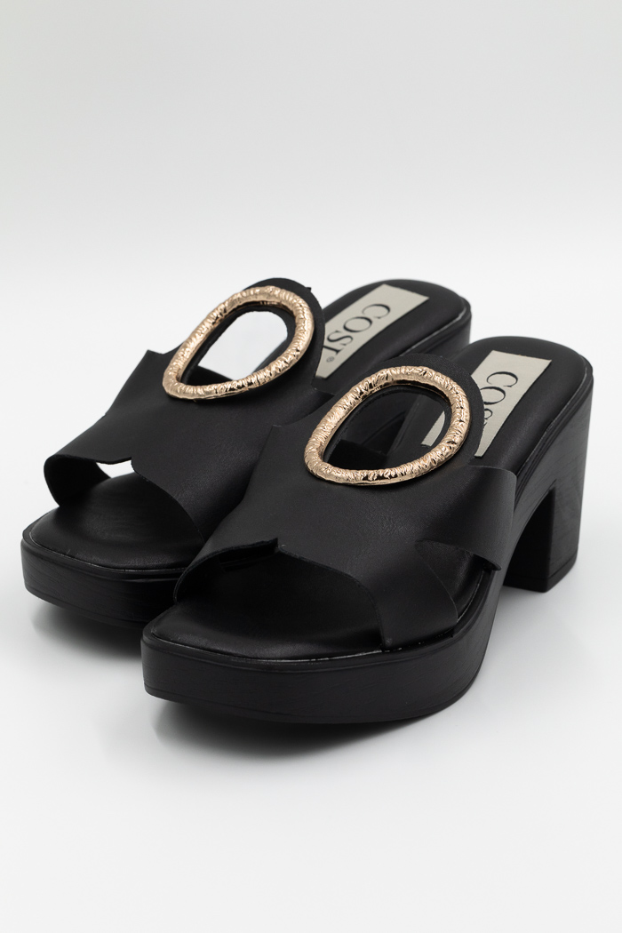 Πέδιλα mules με χρυσή κυκλική αγκράφα. Διαθέτουν τετράγωνο τακούνι και φιάπα για άνετο και σταθερό βάδισμα.