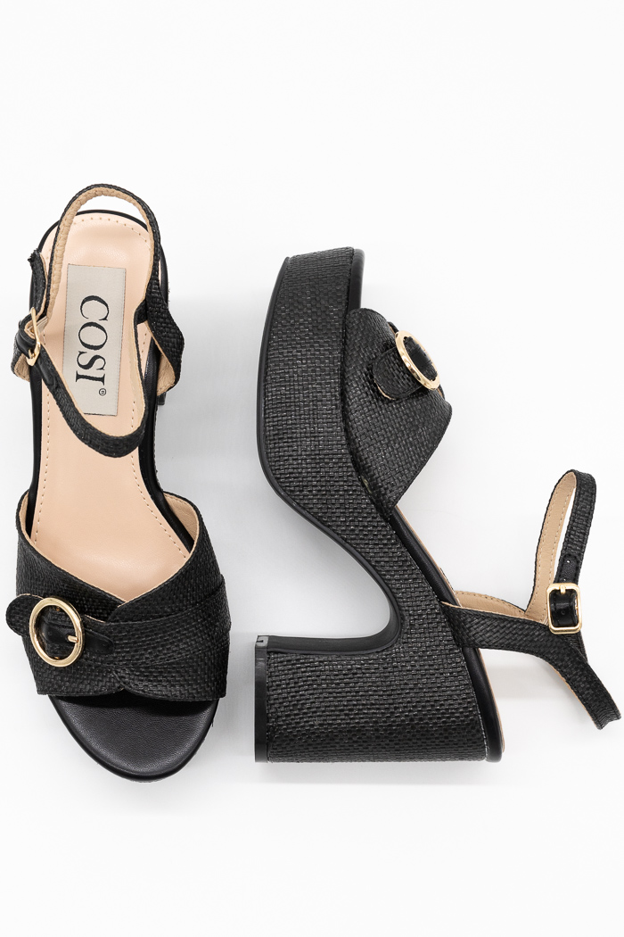Πέδιλα τύπου ψάθα με προσαρμοζόμενο λουράκι στη φάσα, που προσφέρει άνεση και σταθερότητα. Διαθέτουν τετράγωνο τακούνι για μοντέρνο και σταθερό βάδισμα.
