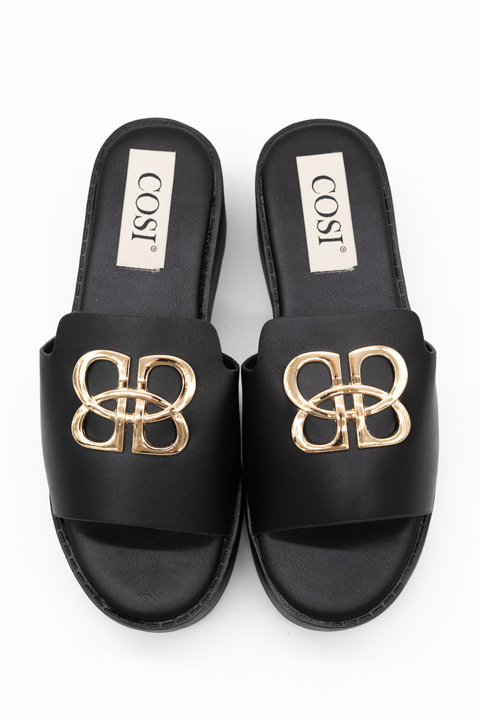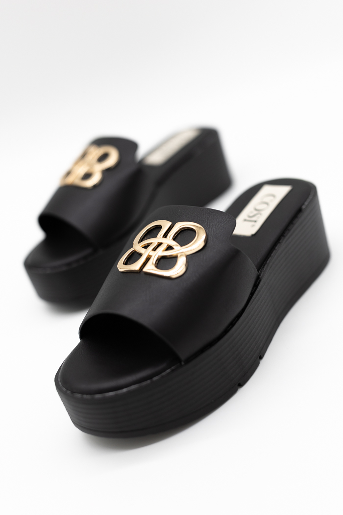 Στιλάτες πλατφόρμες με χρυσή αγκράφα στη φάσα που προσθέτει κομψότητα. Ο μαλακός πάτος εξασφαλίζει άνεση σε κάθε βήμα, ιδανικές για καθημερινή χρήση και καλοκαιρινές εξόδους.