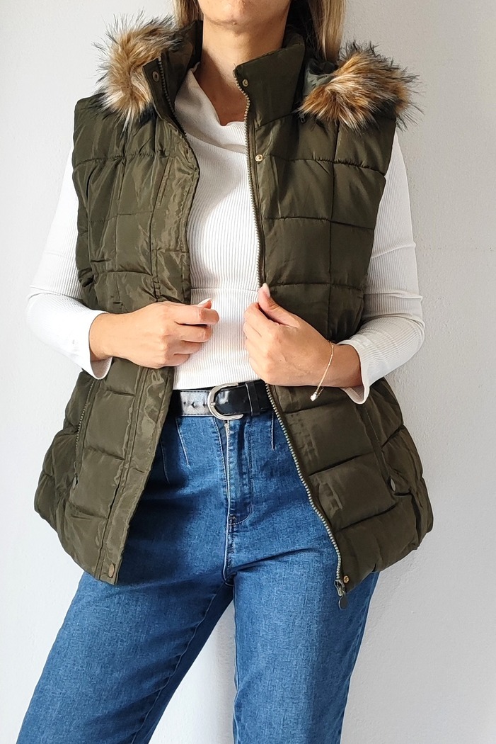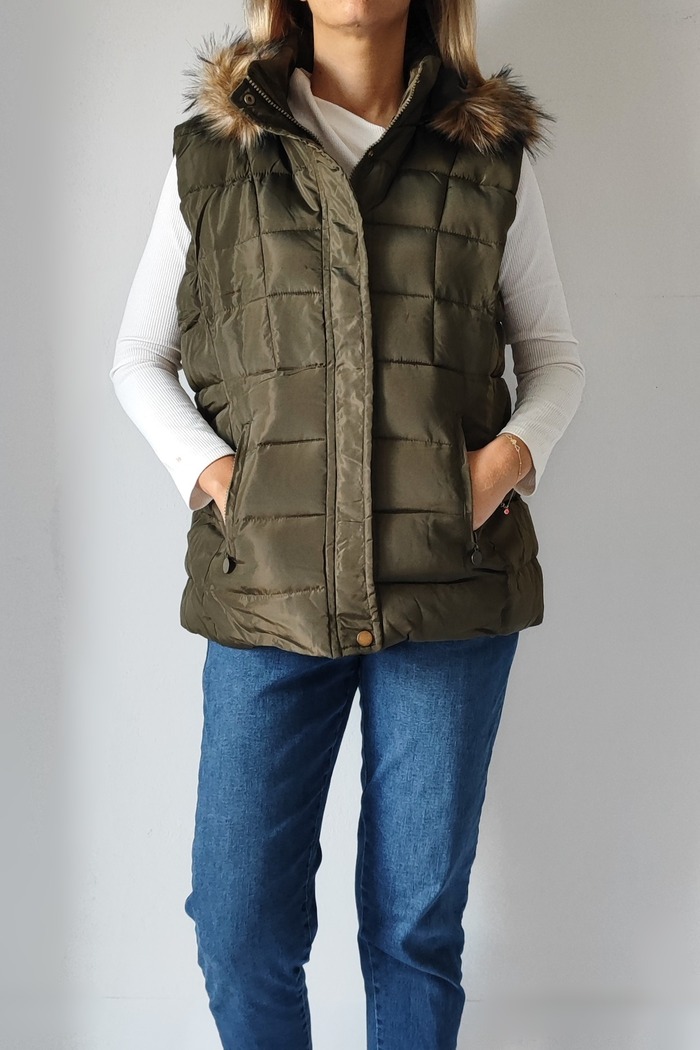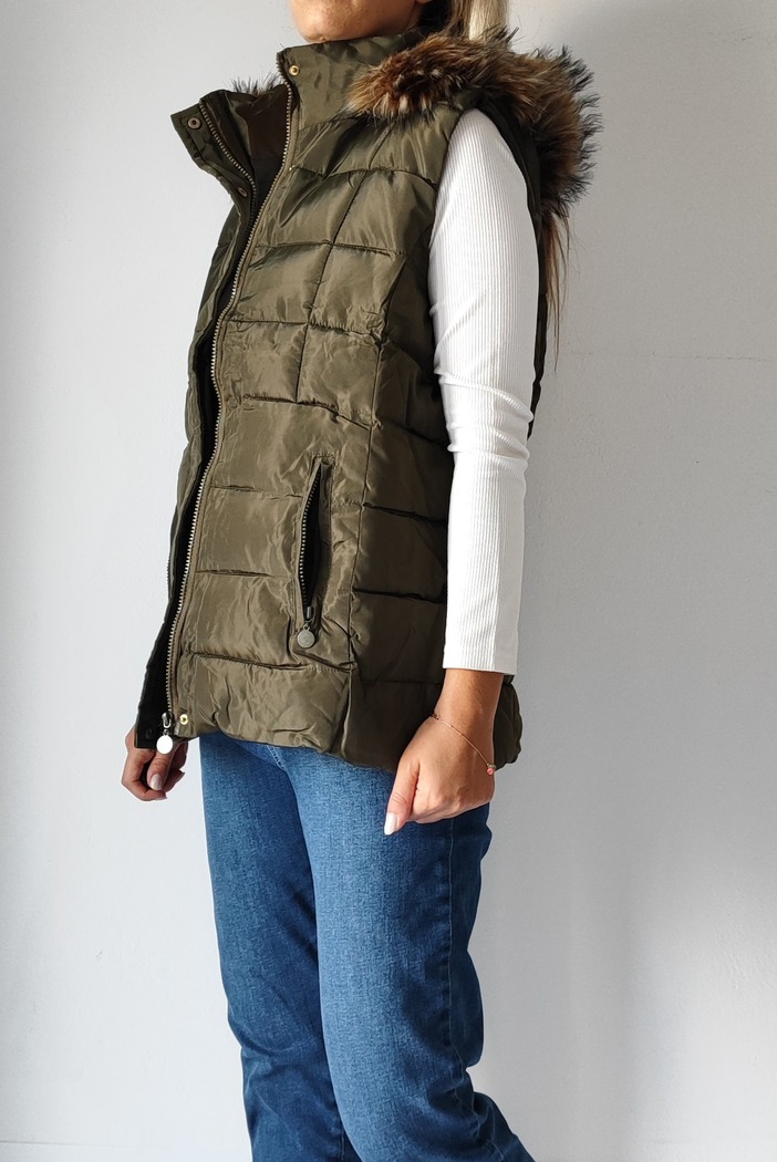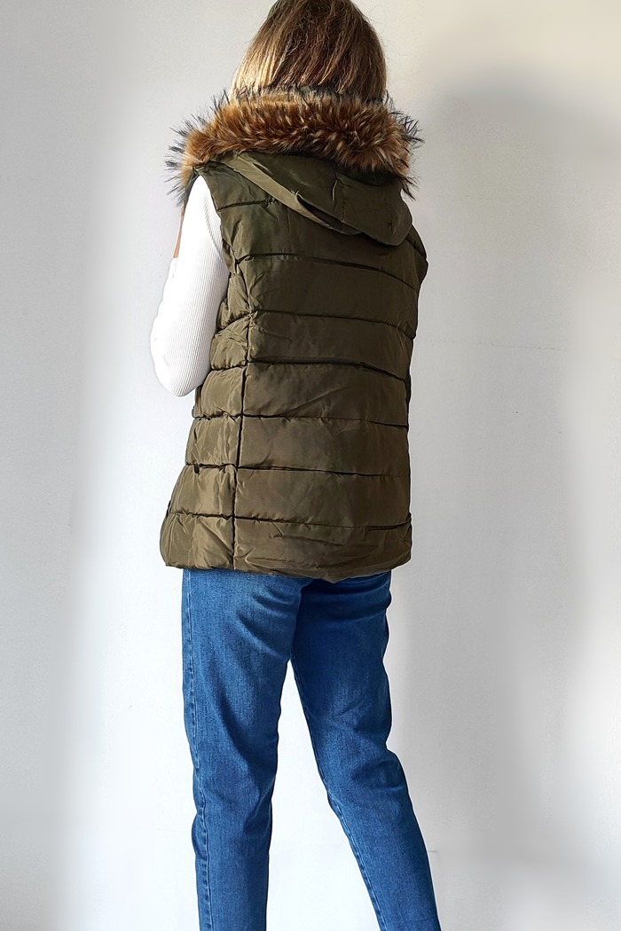 Αμάνικο κοντό μπουφάν με γούνινη κουκούλα 8123- Λαδί