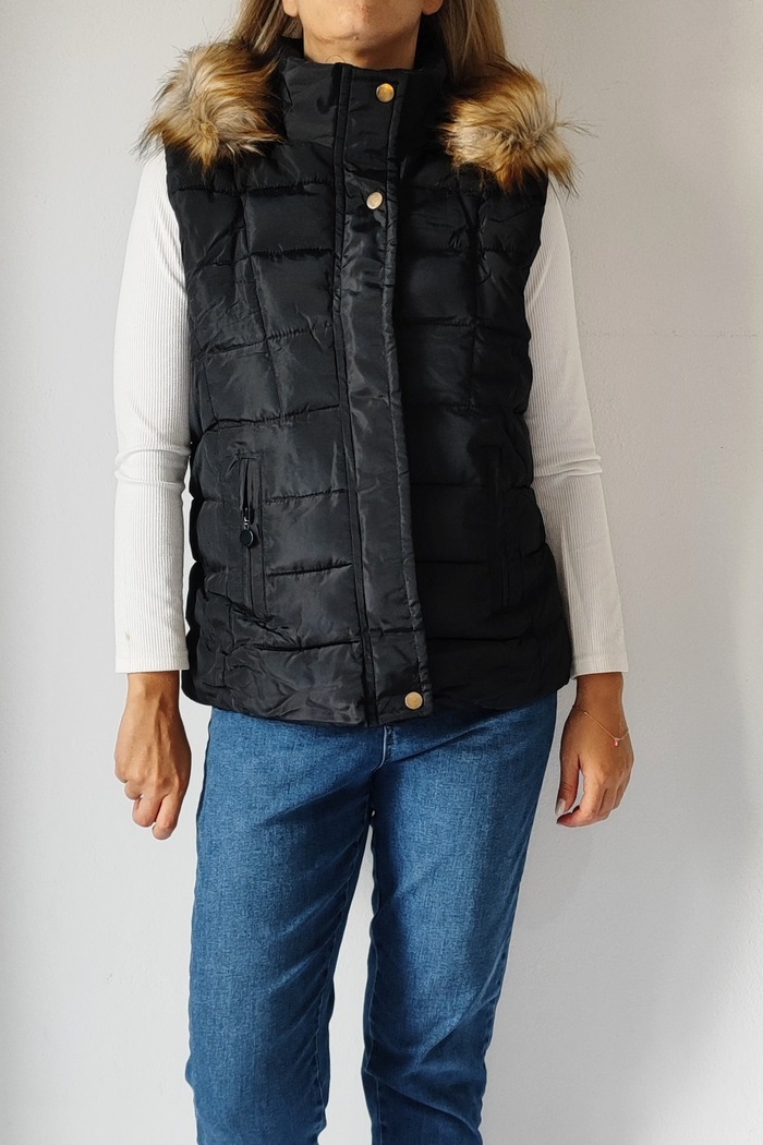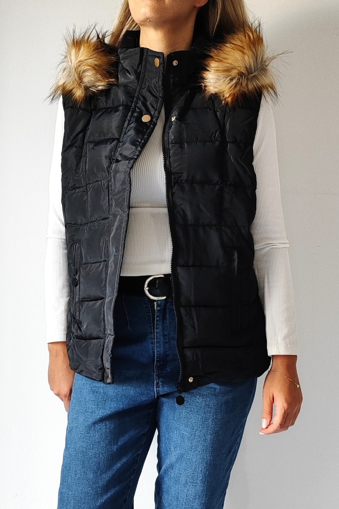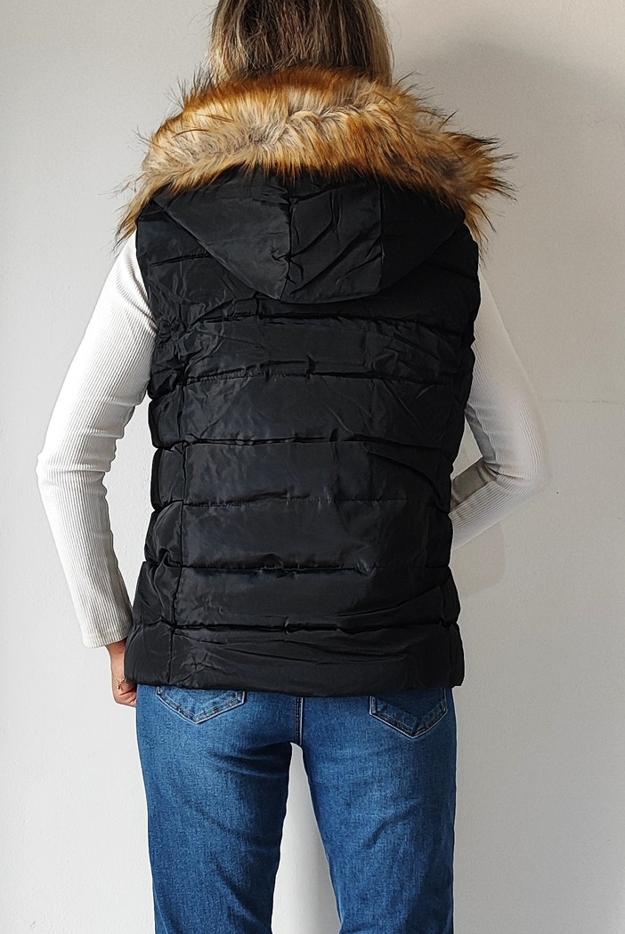 • Αμάνικο κοντό μπουφάν με γούνινη κουκούλα 8123- Μαύρο