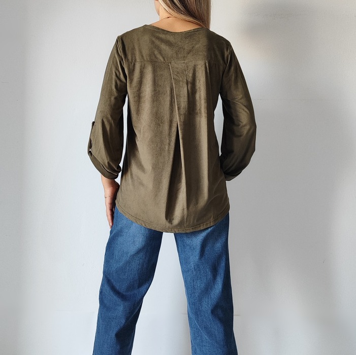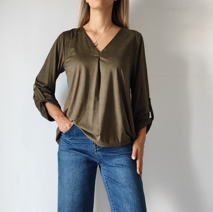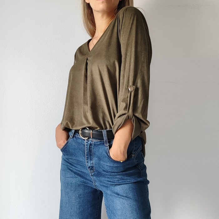 Αρχική σελίδα Shop Γυναικεία Ρούχα Μπλούζες Μπλούζα με V λαιμόκοψη σουέτ alcantara 1001- Λαδί