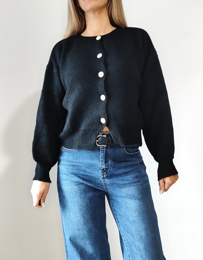 Ζακέτα πλεκτή σε λαιμόκοψη. Διαθέτει εντυπωσιακά κουμπιά πέρλες με χρυσή λεπτομέρεια γύρω από το περίγραμμα. Τα μανίκια είναι ελαφρώς φουσκωτά και καταλήγουν σε φαρδύ λάστιχο, που τους δίνει σταθερότητα. Κομψή και θηλυκή επιλογή, ιδανική για layering πάνω από τη πουκαμίσα ή basic μπλούζες. Cott. 50% Acrl. 50%.