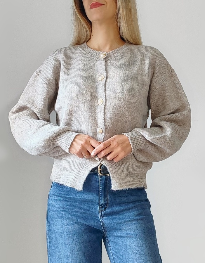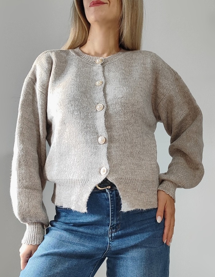 Ζακέτα πλεκτή σε λαιμόκοψη. Διαθέτει εντυπωσιακά κουμπιά πέρλες με χρυσή λεπτομέρεια γύρω από το περίγραμμα. Τα μανίκια είναι ελαφρώς φουσκωτά και καταλήγουν σε φαρδύ λάστιχο, που τους δίνει σταθερότητα. Κομψή και θηλυκή επιλογή, ιδανική για layering πάνω από τη πουκαμίσα ή basic μπλούζες. Cott. 50% Acrl. 50%.
