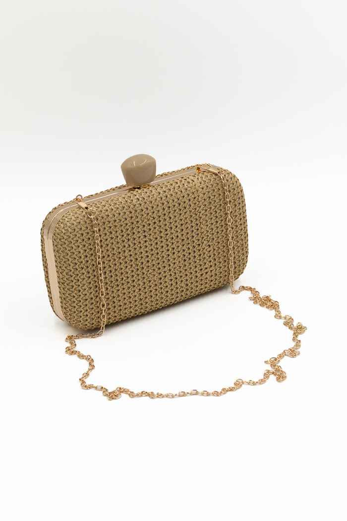 Ψάθινη τσάντα clutch με εντυπωσιακό κοκκάλινο κλιπ και αλυσίδα για να κρατηθεί στον ώμο.